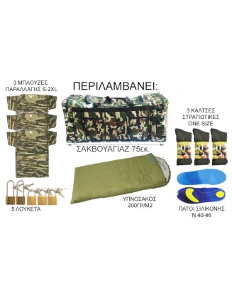 79,00 €Σακίδιο νεοσύλλεκτου στρατού ξηράς / αεροπορίας. Το σακίδιο περιλαμβάνει: 3 μπλούζες S-2XL (με δυνατότητα επιλογής.